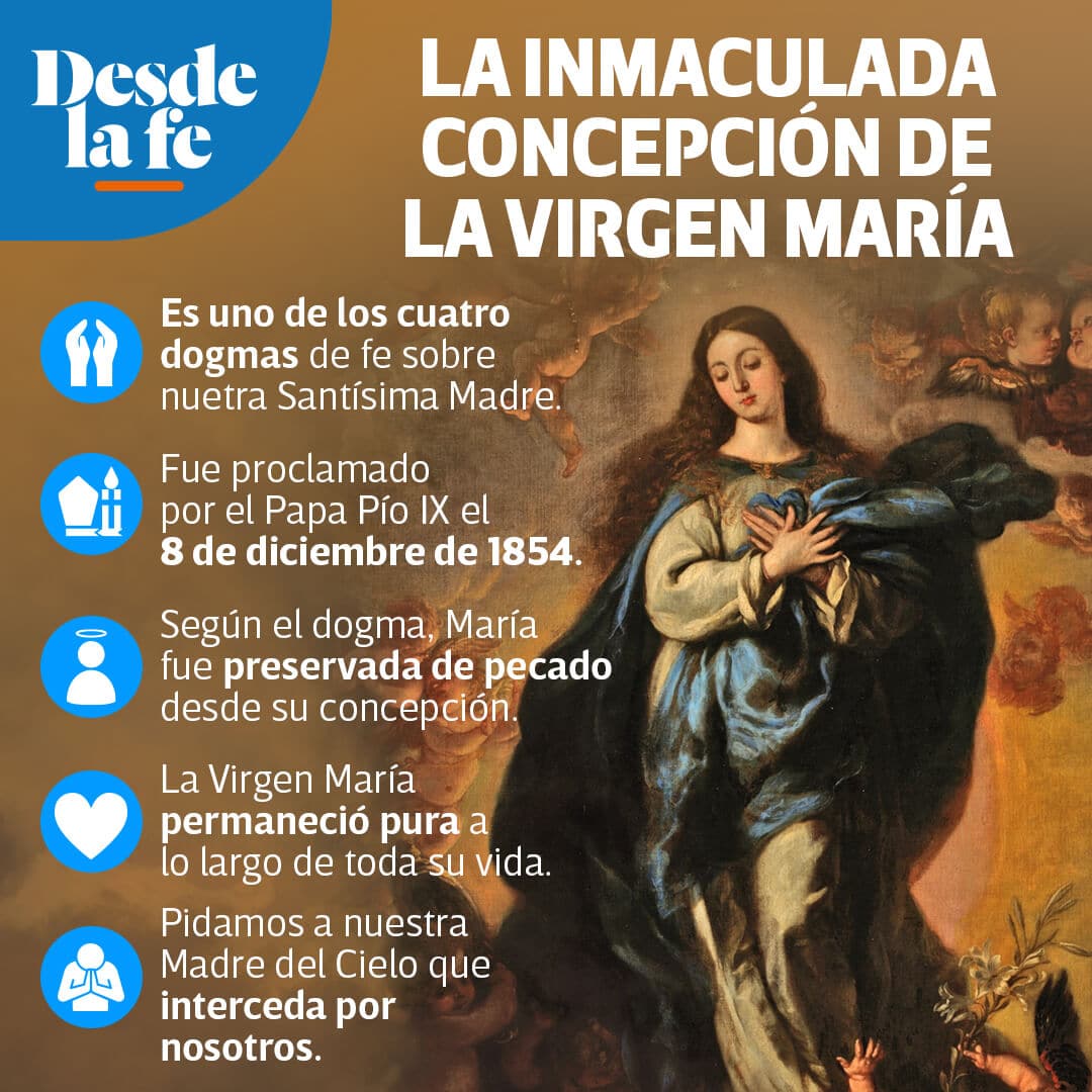 El dogma de la Inmaculada Concepción, proclamado por el Papa Pío IX en 1854, afirma que María fue concebida sin pecado original, es decir, sin la mancha del pecado heredada por todos los demás seres humanos desde Adán y Eva. Según esta doctrina, María fue preservada por gracia divina de la culpa original y vivió una vida sin pecado.